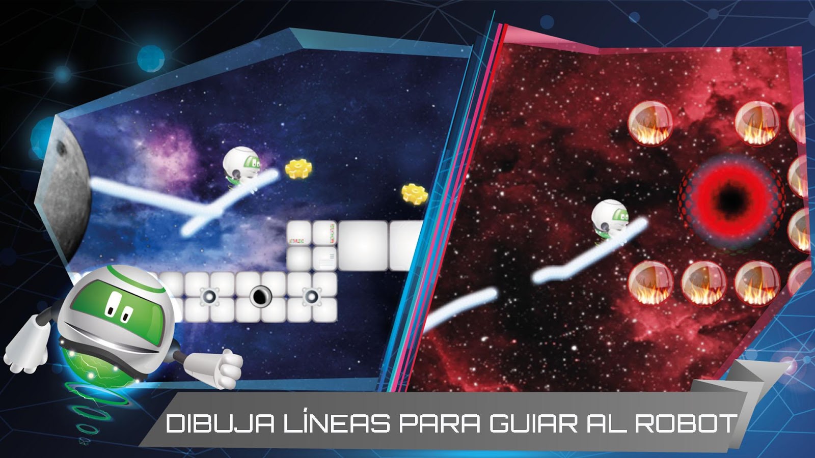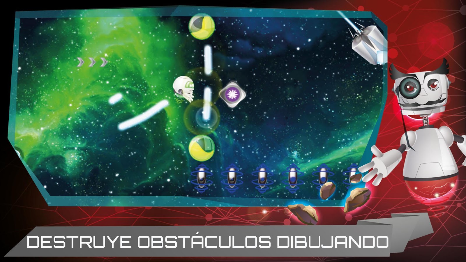 Descubre el juego que ha revolucionado el control de los personajes y demuestra tu habilidad con el sistema de control mas novedoso del mercado sin botones. Simplemente dibuja con tus dedos las plataformas para guiar al robot en una divertida aventura a través del espacio, recolecta energía y engranajes para llegar a las bases de los technots y poder obtener potentes modificadores.